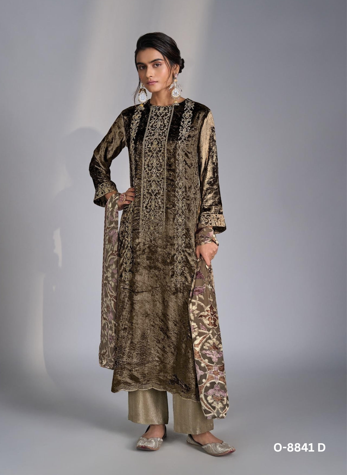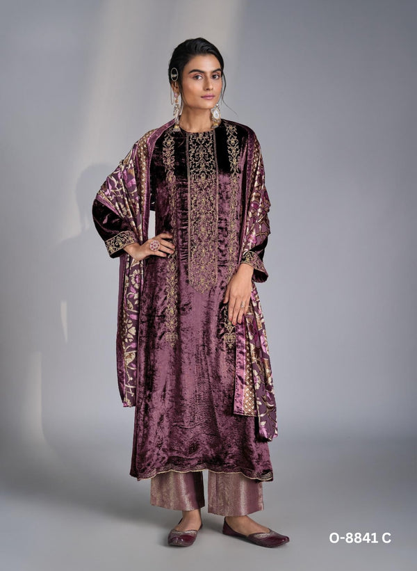 Embrace timeless elegance with this luxurious ensemble designed to make a statement. The outfit features a top made of pure viscose velvet beautifully enhanced with intricate embroidery, offering a regal and refined appeal. The Banarasi jacquard bottom adds a touch of traditional richness, while the velvet brasso dupatta completes the look with graceful sophistication. Perfect for festive gatherings, weddings, and grand celebrations, this ensemble blends luxury and heritage in every detail.